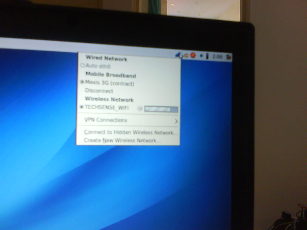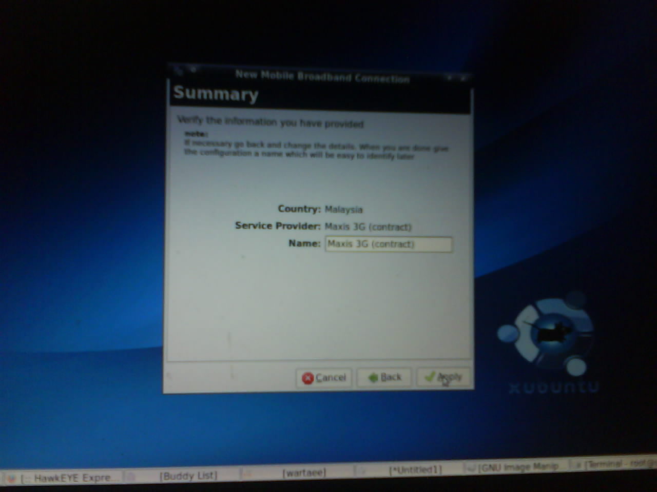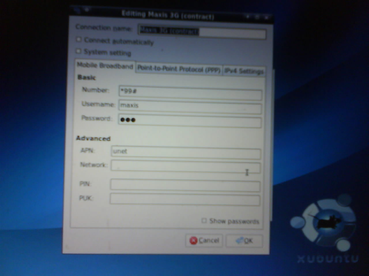 then clicking on network select to connect the Maxis 3G (Contract)..