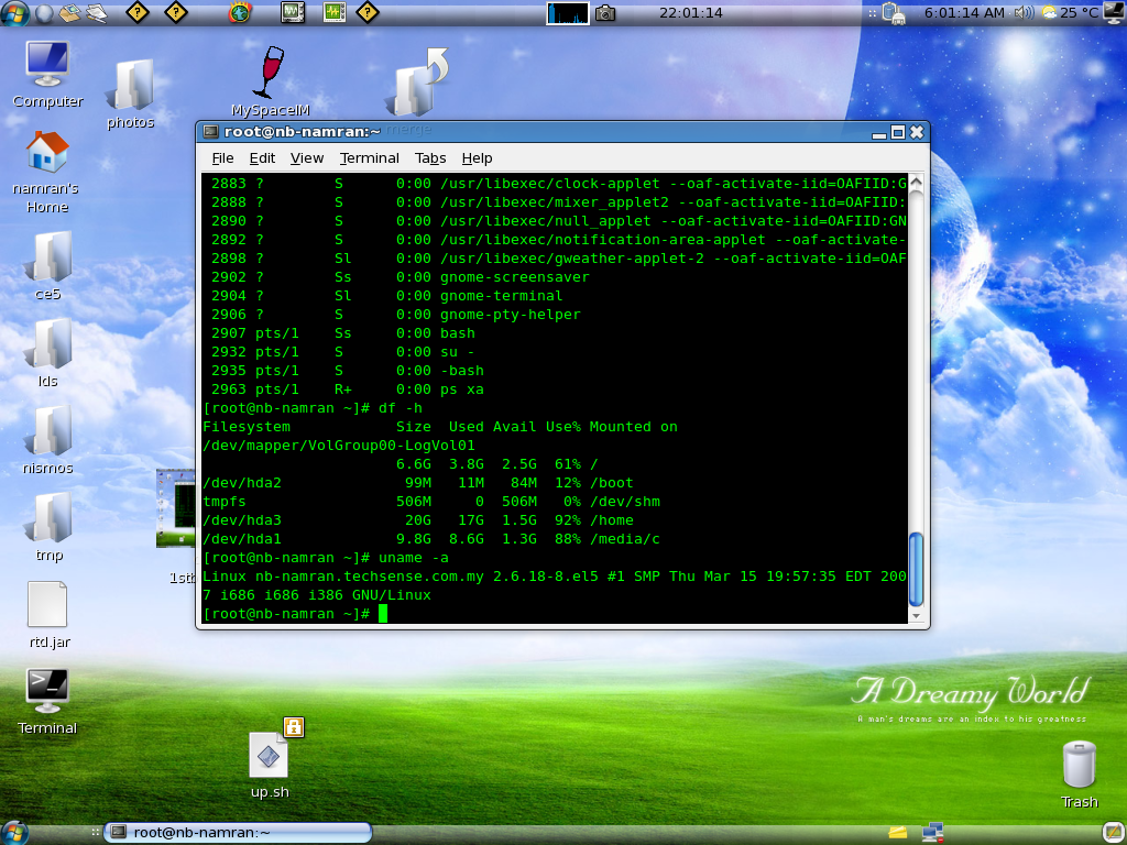 Namran Hussin upgrade to centos 5 November 28, 2007 Posted Under: personal after a night of unsuccessful of online upgrade to centos 5. due to limitation of disk space of / somehow its required more than what i have to upgrade. of course when something break while upgrading.. 😛 then I re-do with a clean install.. Share Facebook Twitter Linkedin Pinterest Google+ Previous How to make a CentOS 4 Live CD November 28, 2007 Next cs in linux November 28, 2007 Related Post Overdraft facility talk at bijak wang tv3 February 7, 2010 How to enable photo sharing for yahoo messenger in CentOS 5 (linux) June 6, 2009 How to read a book – infographic May 18, 2016